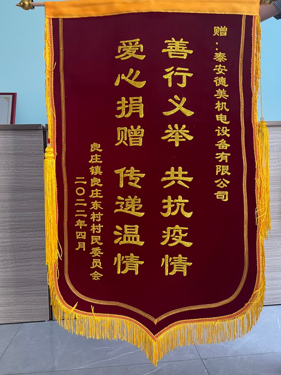 近日,良莊鎮良莊東村村民委員會(huì )將寫(xiě)有“善行義舉,共抗疫情,愛(ài)心捐贈,傳遞溫情”的錦旗送到泰安德美機電設備有限公司,對本次抗擊疫情所做貢獻給予充分肯定!