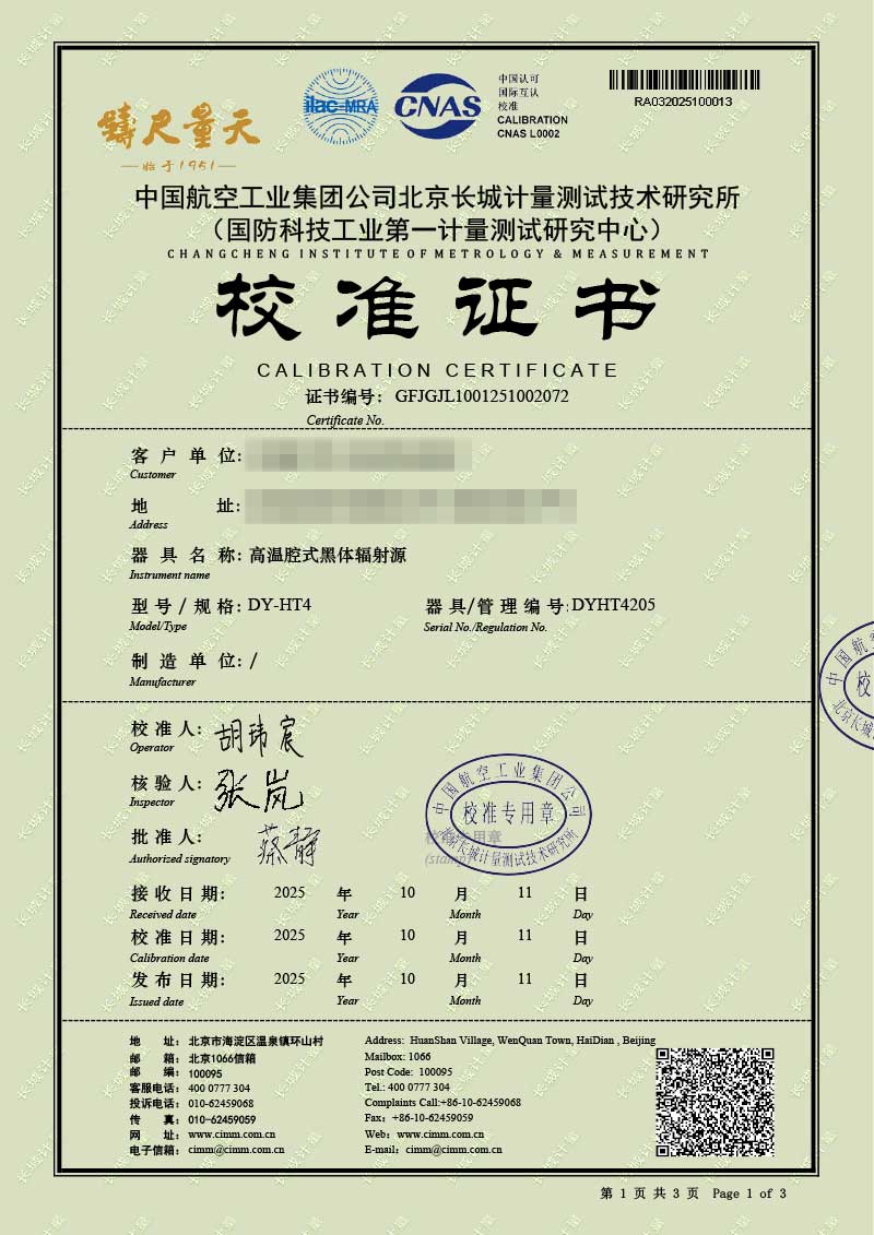 高溫腔式黑體輻射源(700-1600℃)校準證書(shū) 2025-10-30 本文被閱讀 7 次