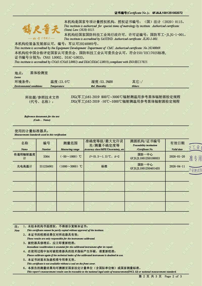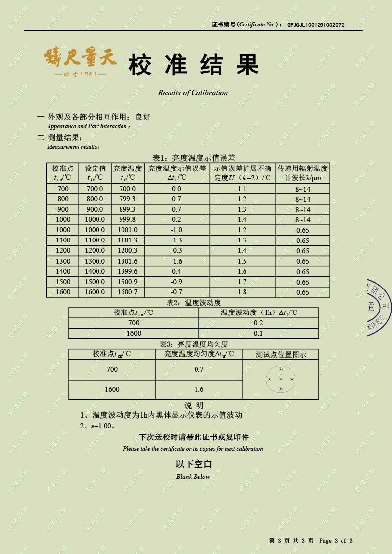 高溫腔式黑體輻射源(700-1600℃)校準證書(shū)